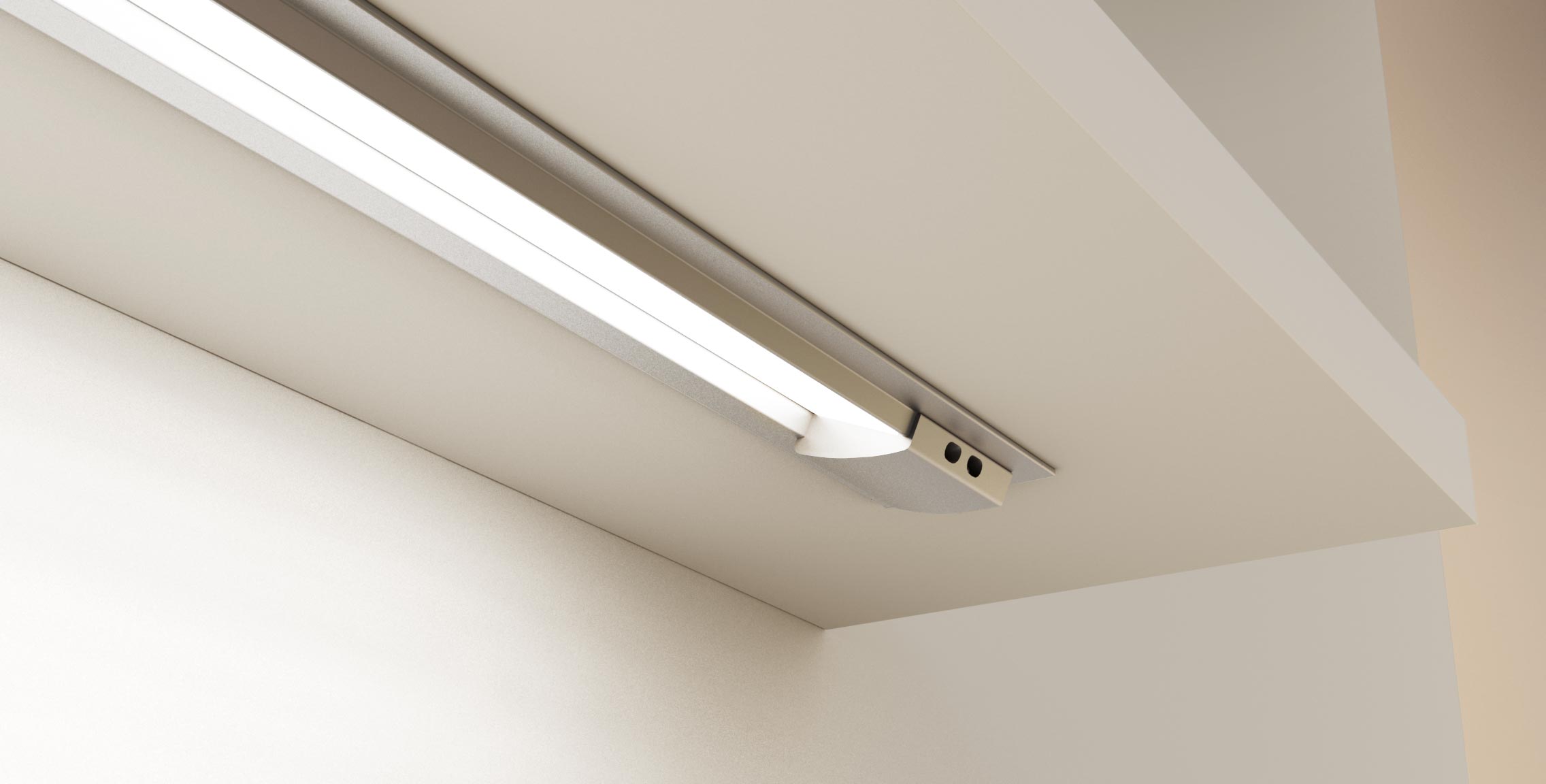 Entstanden ist die neue, klar geformte GERA Einbauleuchte abgewinkelt, die sich tief in die Möbelfläche hineinschmiegt und die breitenvariabel verplant werden kann. Ihr nach hinten gerichtetes, lückenloses Licht bestrahlt das Innere des Schrankes, nicht die Augen des Betrachters.