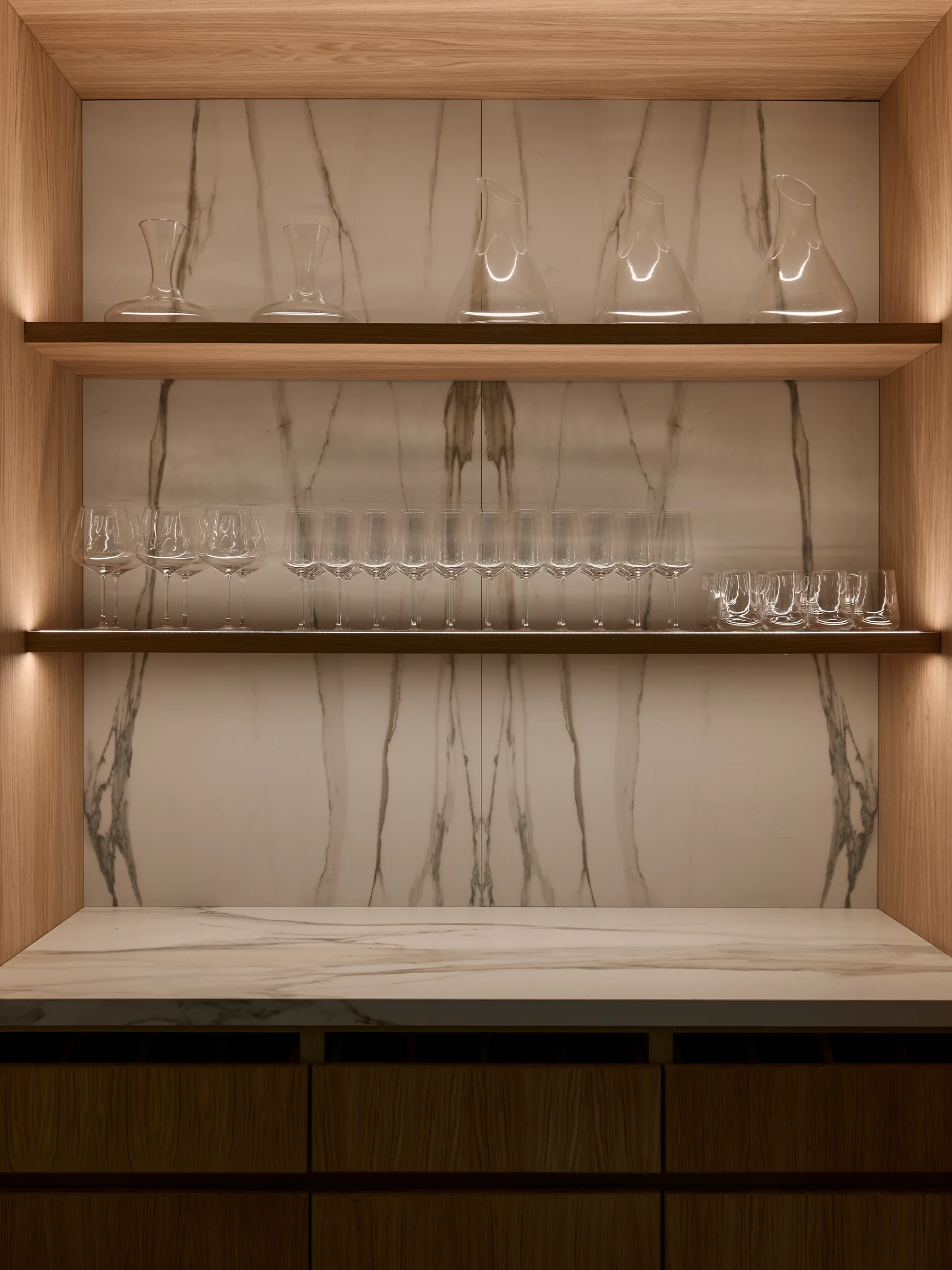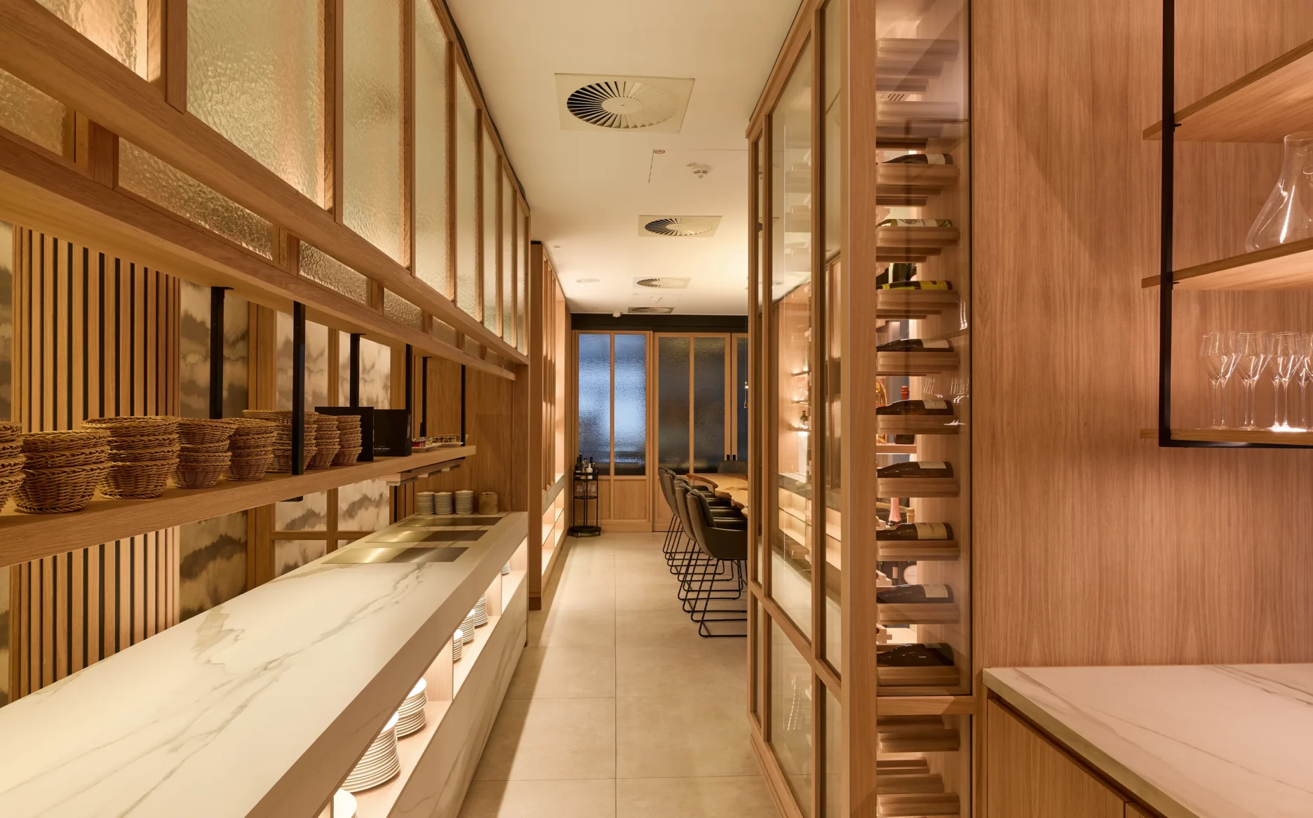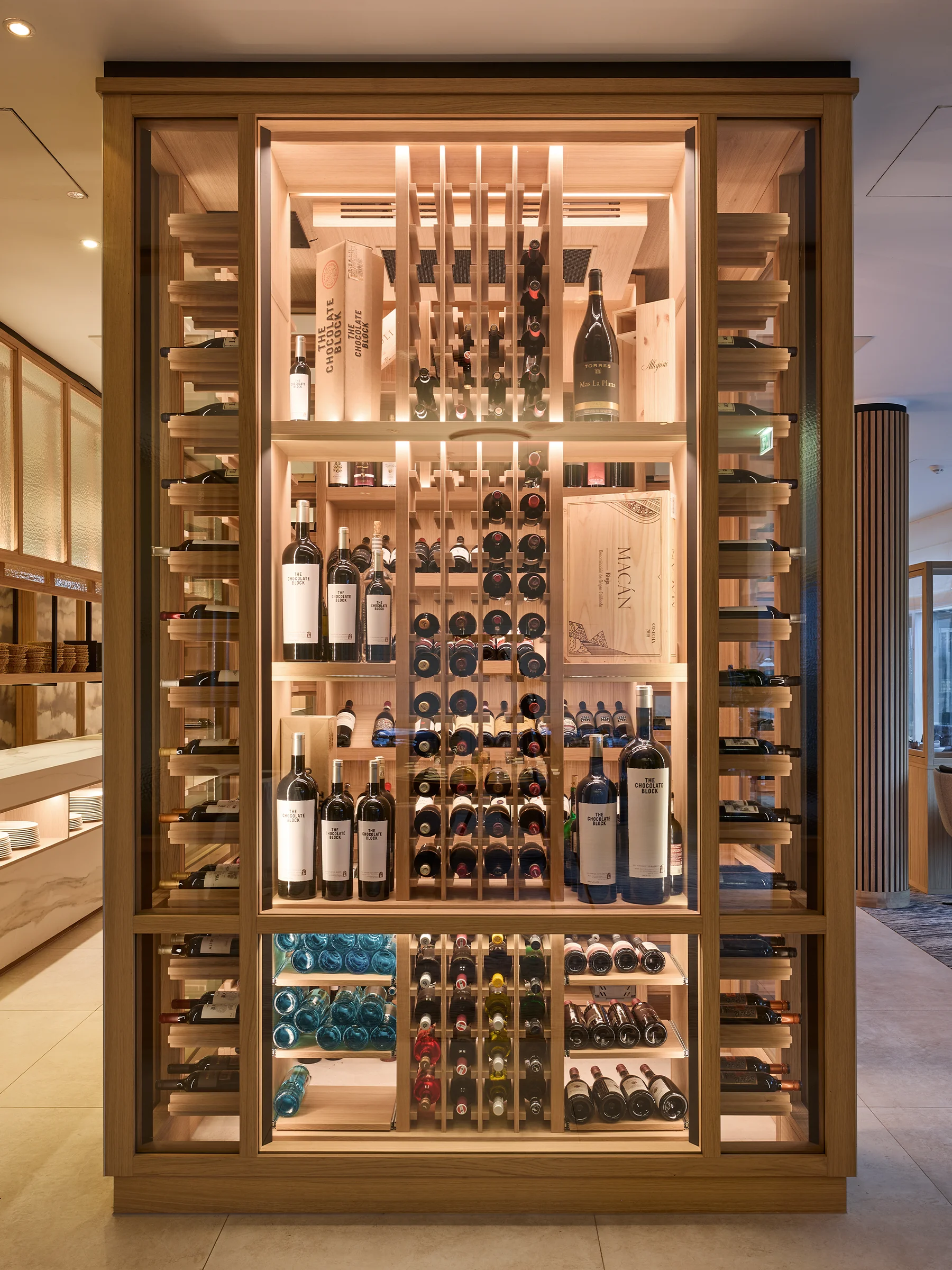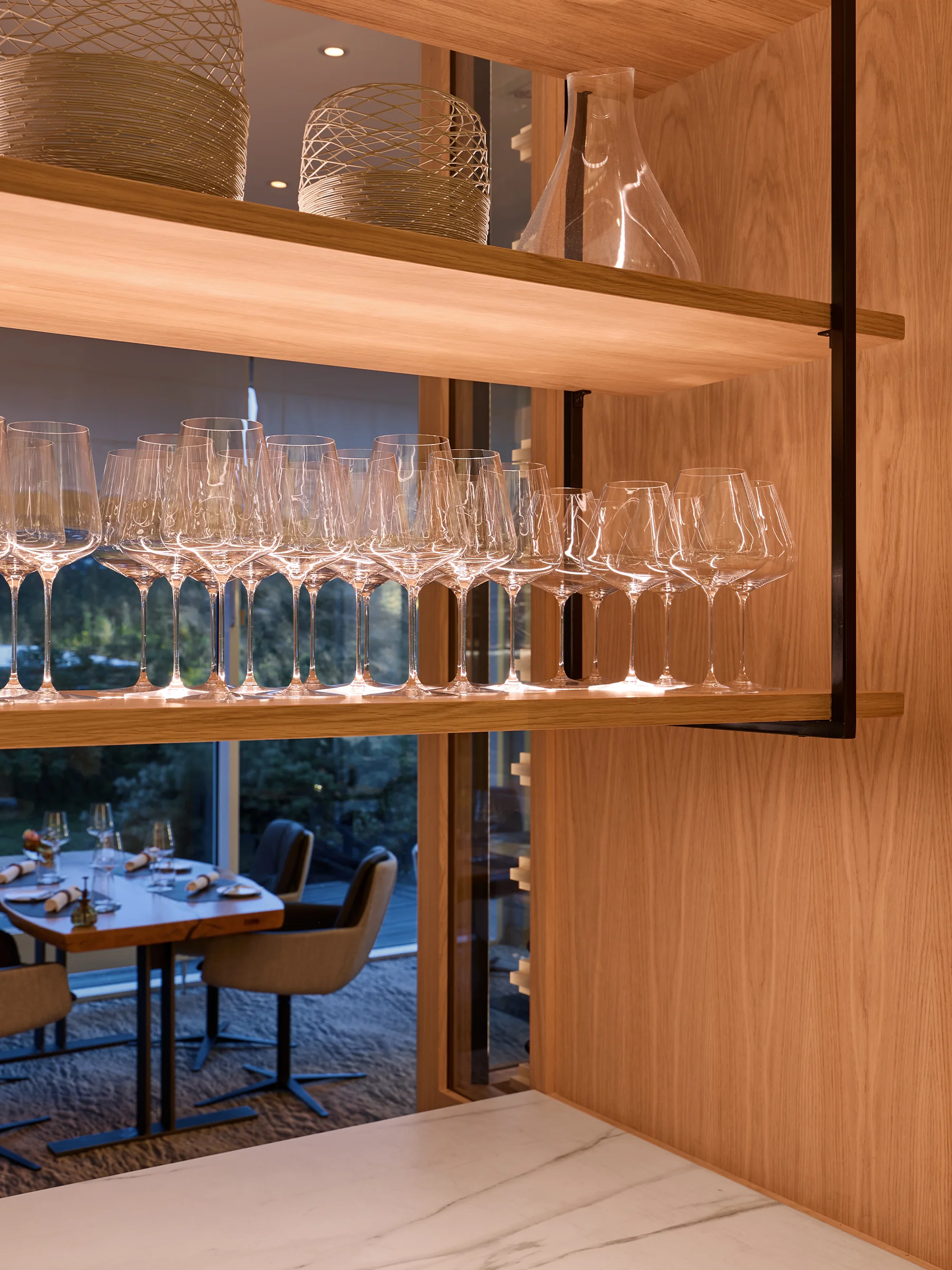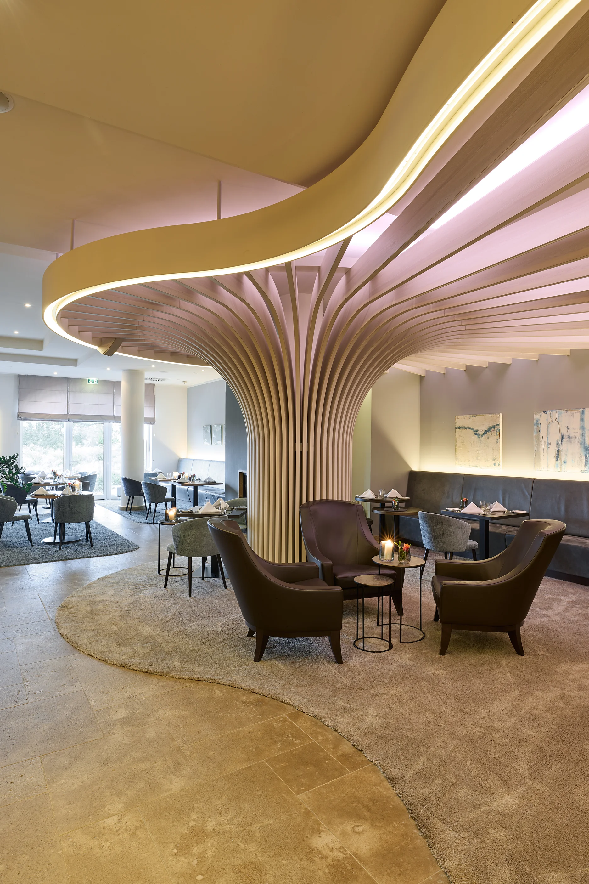 Im Strandhotel Dünenmeer wird Licht Teil des Raumerlebnisses. Präzise geführte, indirekte Beleuchtung modelliert Architektur, betont Materialien und schafft fließende Übergänge. Neben dem skulpturalen Holzelement im Empfangsbereich bildet der indirekt beleuchtete begehbare Weinsckrank das Herzstück im Restaurantbereich.